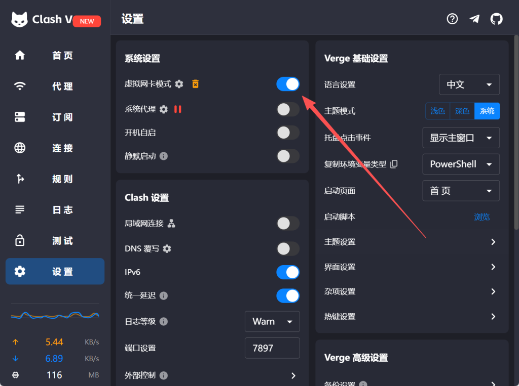 选择科学网络并开启TUN模式