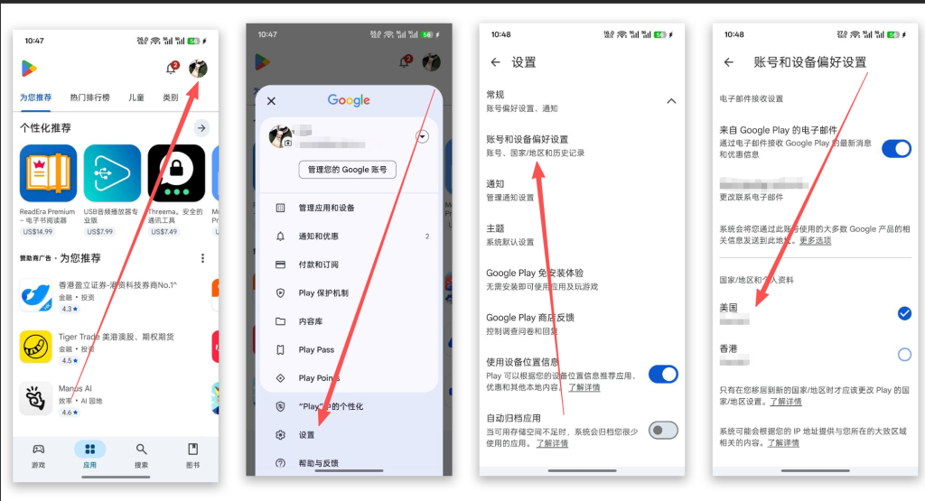 我是通过Google Pay去查看我自己的账号是哪个国家地区的,手机端直接打开Google Play,然后点击你的头像,点击设置,然后点击常规-账号和设备偏好设置,然后就能看到你的账号归属地是哪里了