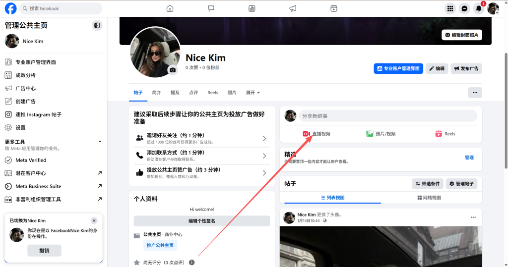 首先我们需要在公共主页发起直播,再发起直播的时候,我们可以写好今天直播的主题,然后帖子评论那里我们可以加上我们想要引流的独立站连接等等,这些自己准备即可!