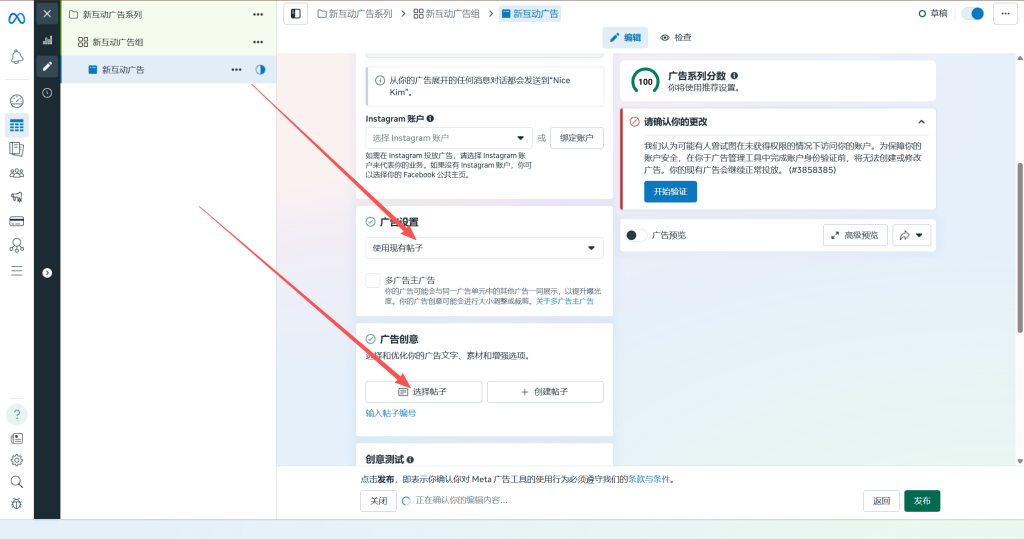 最后广告设置这里,我们选择使用现有帖子,然后广告创意这里就能找到我们正在直播的帖子,最后发布,稍等一会之后就能正常的消耗来流量了!