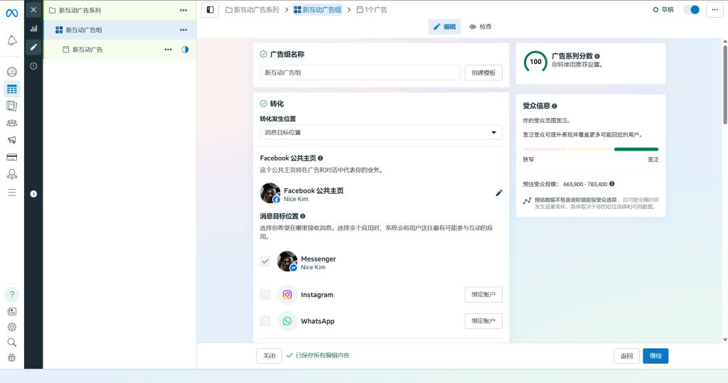 广告组设置里面,转化发生位置我们选择:消息目标位置,然后选择我们的直播公共主页