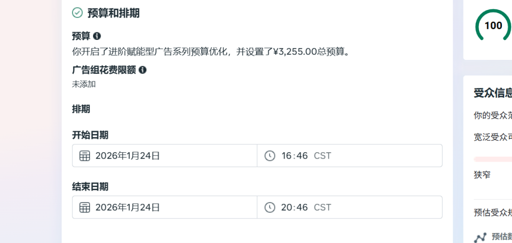 然后预算选择为广告系列预算,选择总预算,并设置好自己的总预算目标是多少