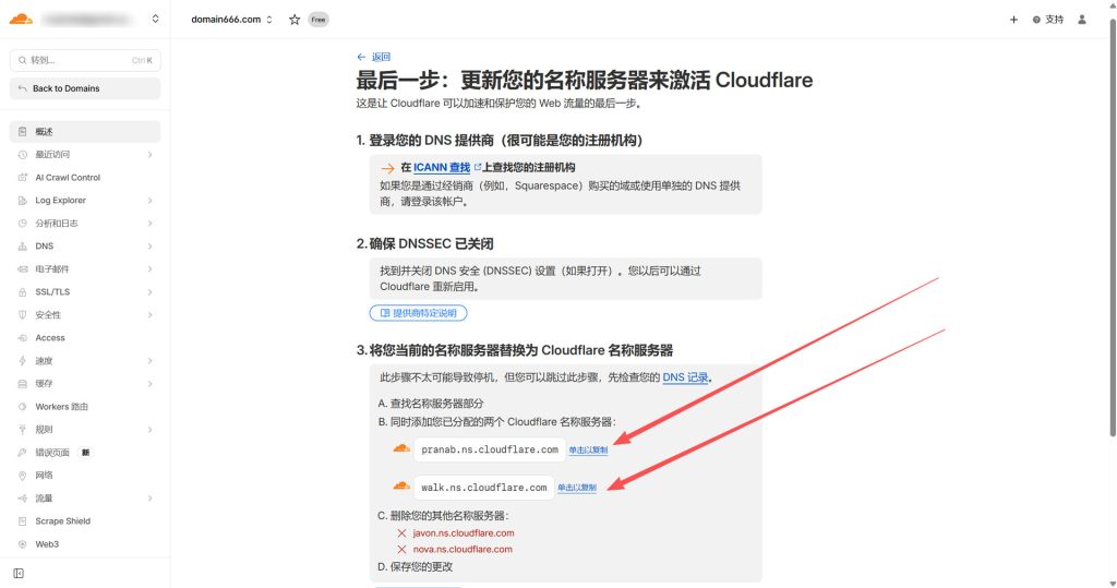选择了免费计划之后,啥也不用管,继续点击下一步,来到最后一步:更新您的名称服务器来激活 Cloudflare!这里你就能看到分配的两个 Cloudflare 名称服务器,这两个服务器记录下来,需要填写到namesilo后台