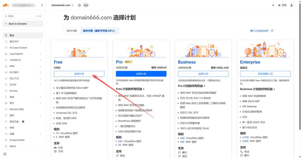 来到cloudflare的首页,然后选择加入域,输入你在namesilo购买的域名,其他保持默认,点击继续,然后选择Free计划