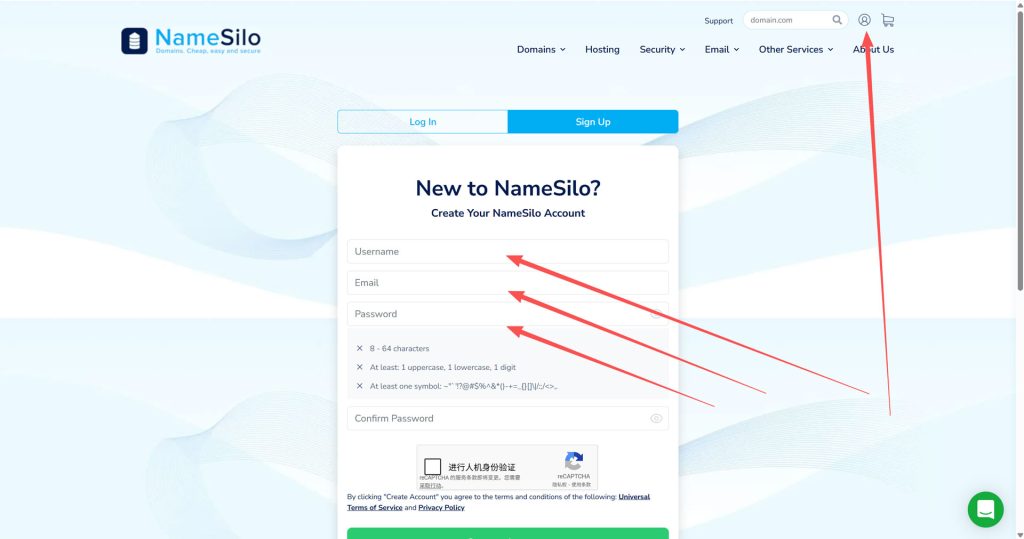 首先,请注册一个namesilo账号,必须要准备好一个邮箱,最好有谷歌邮箱,因为最后谷歌邮箱在建站过程中也是需要用到的;来到Namesilo官网,然后点击右上角的小人头,点击sign up,然后输入用户名,邮箱,密码即可!
