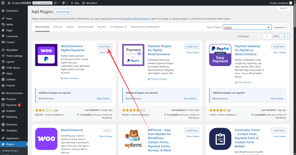 点击plugin,然后搜索PayPal,我们选择第一个woocommerce paypal payment插件点击安装并且激活!
