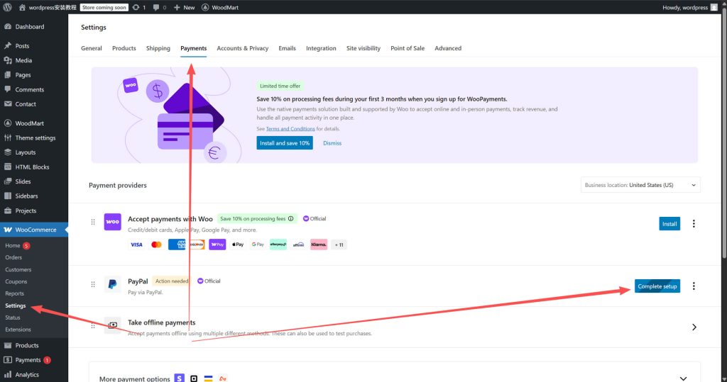 点击woocommerce,点击setting,然后找到payment选项,点击PayPal配置,按照步骤一步步配置,即可链接绑定你的PayPal账号,这样子你就能在网站进行下单操作了!