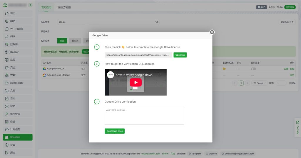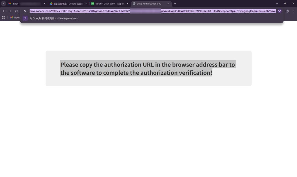 然后我们就会看到以下的页面,这个时候,按照页面提示要求我们,把URL链接,复制粘贴到宝塔Google Drive verification里面,然后点击Confire at once