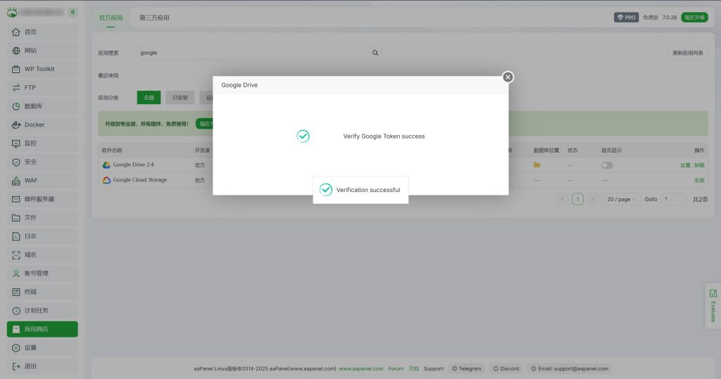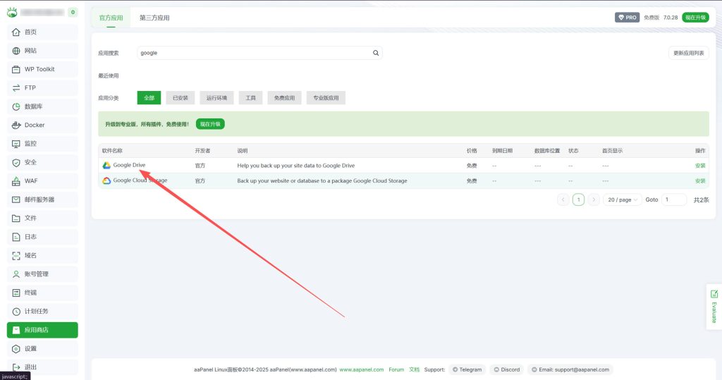 点击宝塔应用商店,然后搜索Google,点击安装Google Drive!