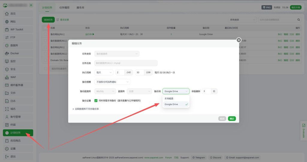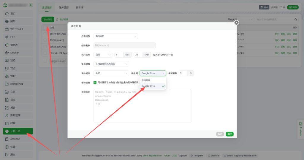 点击宝塔计划任务,新增计划,然后选择备份网站!计划时间可以选择你客户来访最少的时间段,我这里选择了凌晨两点半,然后选择备份到Google Drive!
