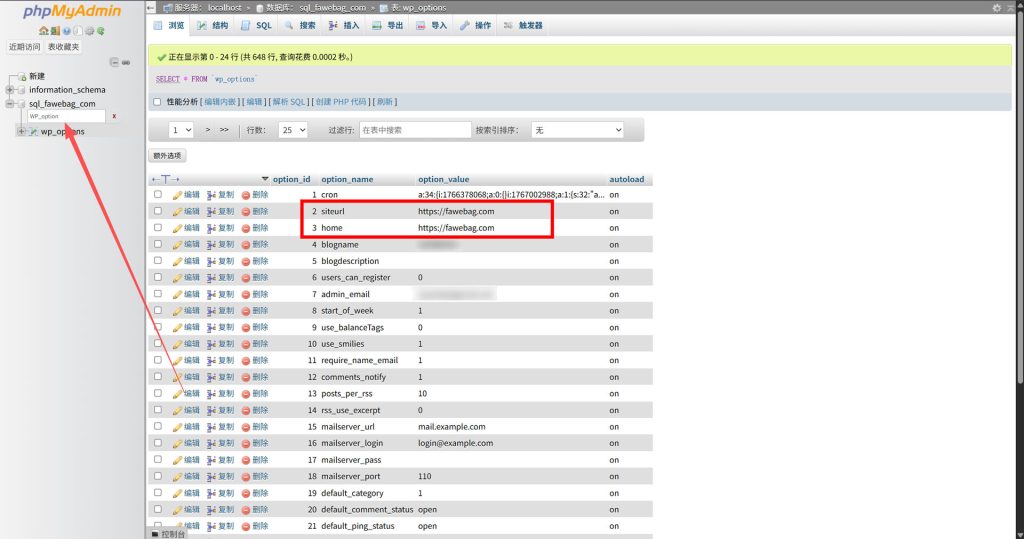 输入我们数据库的账号密码之后,登录我们的数据库,然后搜索wp_options,在右边我们能看到siteurl和home的链接还是显示老域名的链接,此时我们要手动改成我们新域名的网站链接!
