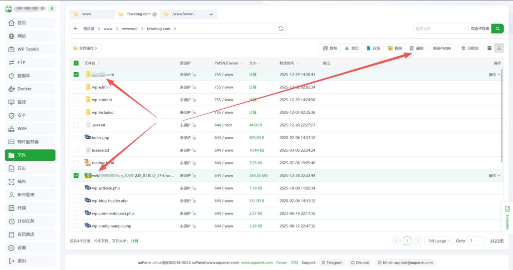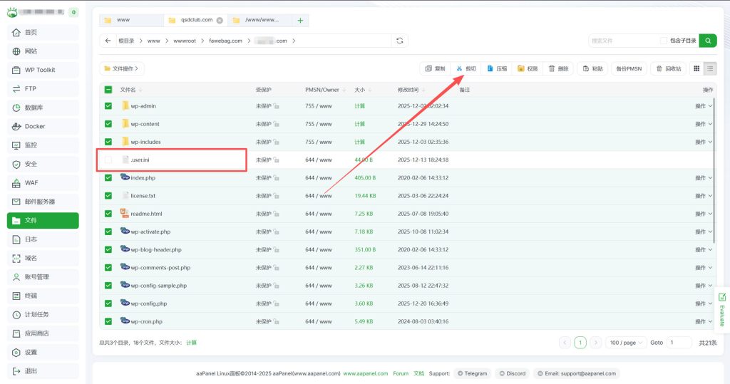 把老域名文件夹里面的文件(除了那个.user.ini文件不用选),其他全部剪切并粘贴到网站的根目录下面