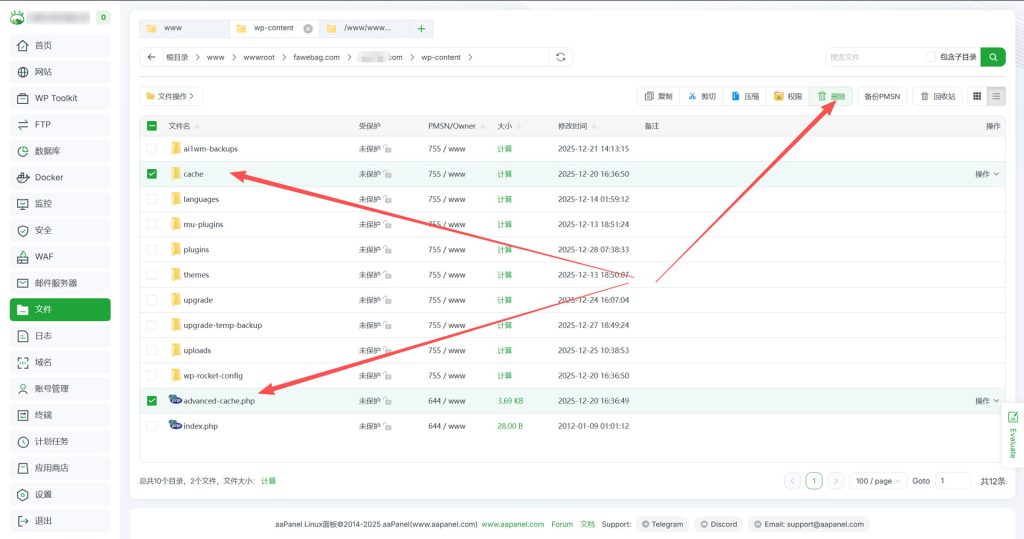 接下来我们就看解压之后的文件,我们点击进去,wp-content文件夹,然后把里面的Cache文件和advanced-cache.php这两个文件夹删除,这个是缓存文件,会影响我们导入数据