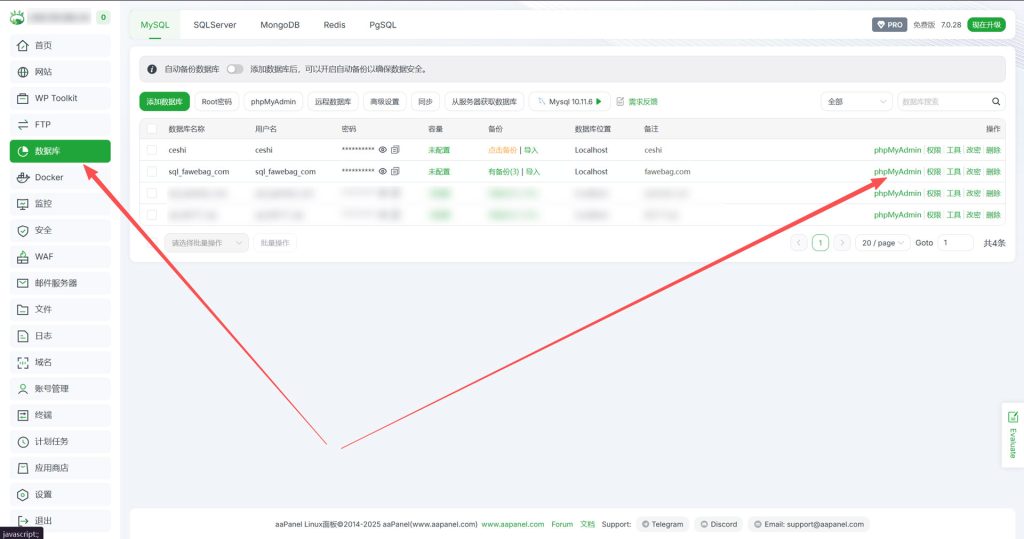 点击数据库,然后点击数据库右边那个phpmyadmin,打开我们的数据库