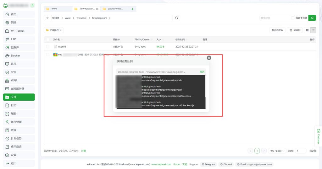 解压,耐心等待一下,由于网站数据一般都会有几百MB,解压比较久,解压完毕之后会自动关闭这个实时任务队列窗口!