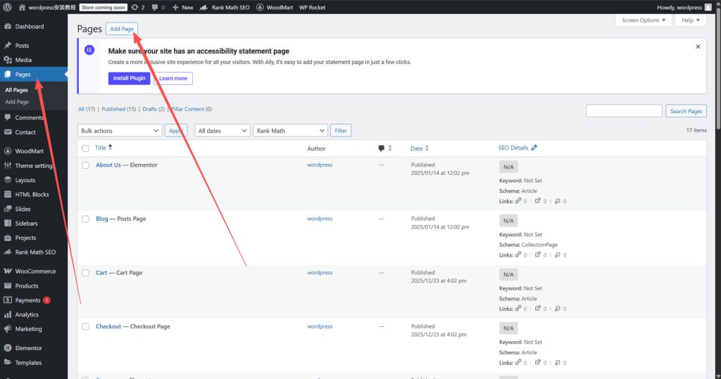 点击wordpress page,然后新增page页面