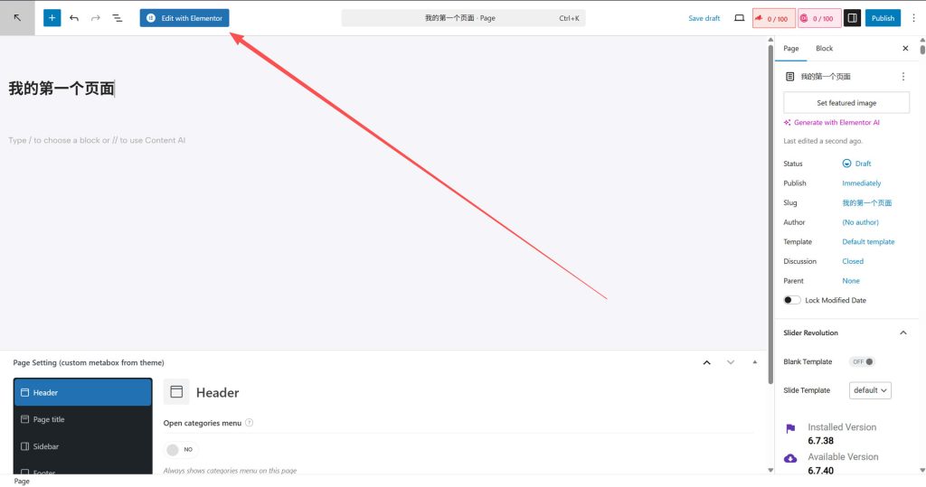 然后创建好页面的标题之后,我们选择elementor编辑;另外,在这里下面,我们能看到Header;Pagetitle;Sidebar;这些模块,这里能够控制你的页面用不同的导航栏,是否展现侧边栏等等,自己研究一下!