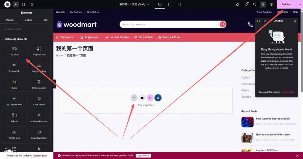 来到elementor编辑模块,左边就是你可以选择的模块,然后把它选中拖到中间,即可使用,最后右上角点击保存发布即可!