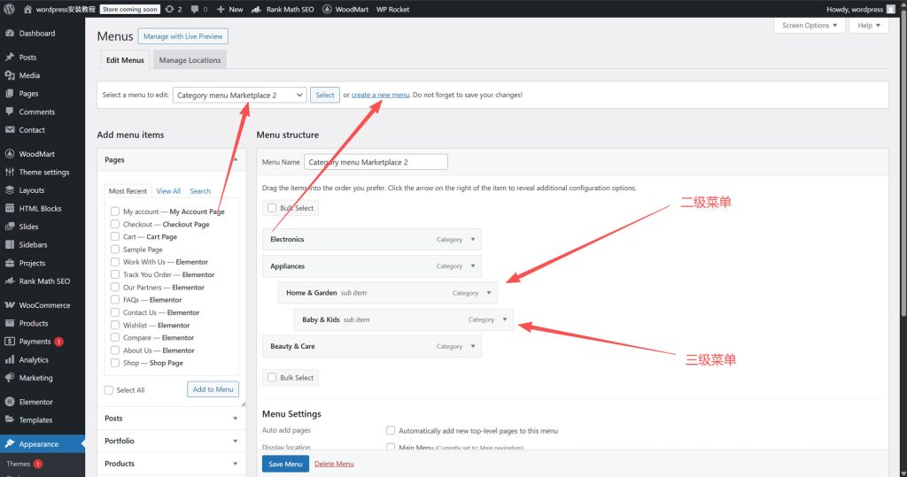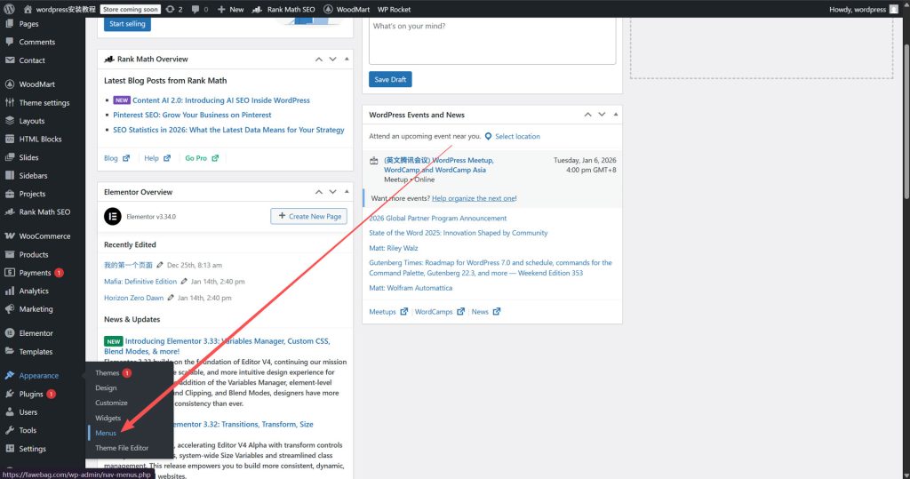 点击wordpress Appearance,点击menu,就能看到你所有的菜单栏